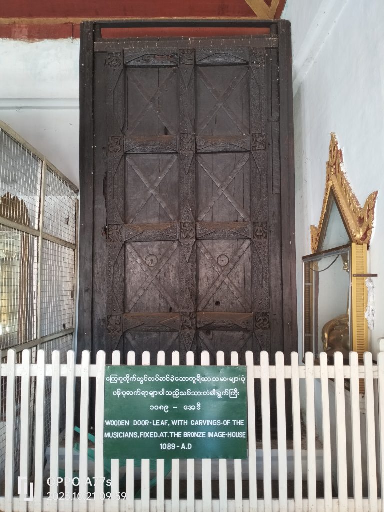 မူလနေရာမှာ ကြေးဂူတိုက်မှ တံခါးဖြစ်မည်ဟု မှန်းဆကြသည်။ တံခါးရွက်ကြီးတွင် လေးထောင့်ကွက်များအတွင်း ပုဂံခေတ် တီးသူ၊ မှုတ်သူ၊ ကသူပုံများပါရှိ၍ သုံးထောင့်ကွက်များအတွင်း ပုဂံခေတ် ကနုတ်ပန်းများဖြင့် တန်ဆာဆင်ထားသည်။
